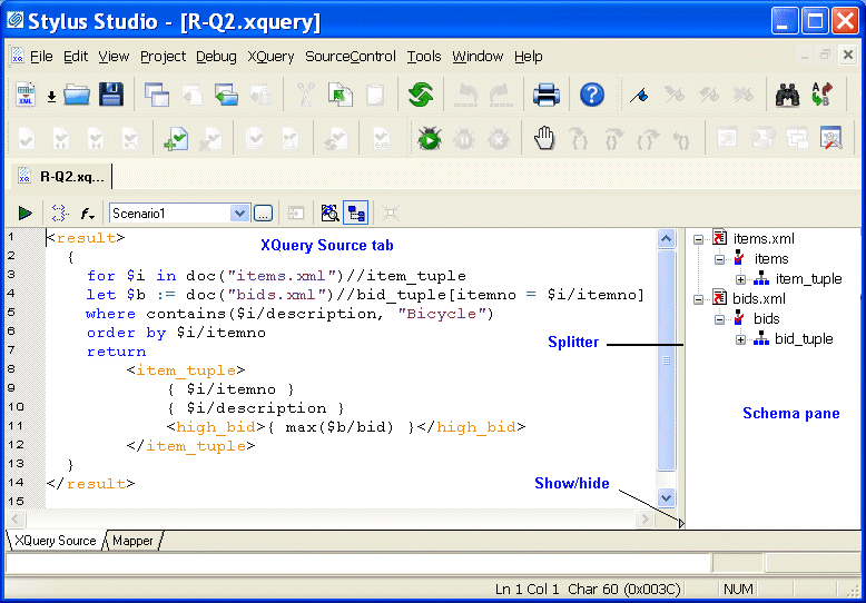 In Stylus Studio, you use the XQuery editor's textual editor and graphical interfaces to work with XQuery. The XQuery editor, which consists of two tabs,