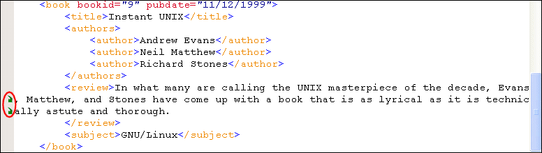 Home >Online Product Documentation >Table of Contents >Text Editing Features Text Editing FeaturesThis section describes some of the more common text editing tools and features in Stylus Studio. Simple Text EditingSelect the text you want to edit and then do any of the following: You can select a portion of text and move it to a new location by dragging it. You can drag text from one document to another. You can drag text from documents outside Stylus Studio to a document in Stylus Studio. Code FoldingCode folding is the ability to collapse three or more lines of code in XML-based editors. For example, this code segment: when collapsed, appears as this: Code folding allows you to simplify the visual presentation of XML-based code; folding does not affect the underlying code. In editors in which code folding is supported, Stylus Studio displays a tree control in the gutter to the left of editing canvas; this is the same area of the editor used to display line numbers, debugging symbols, and back mapping symbols. By default, all code is displayed. What You Can FoldIn XML-based editors, you can fold In the XQuery Source editor, you can fold How to Fold CodeTo fold a segment of code, click the [+] symbol associated with that code.When you fold code, Stylus Studio displays a boxed ellipsis symbol at the end of the line of code you have folded, as shown here: If you place the pointer in the ellipsis symbol, Stylus Studio displays a tool tip that shows you the collapsed code. The amount of code that appears in the tool tip depends on the area on your desktop you have given the Stylus Studio application. Sense:X Speeds Editing