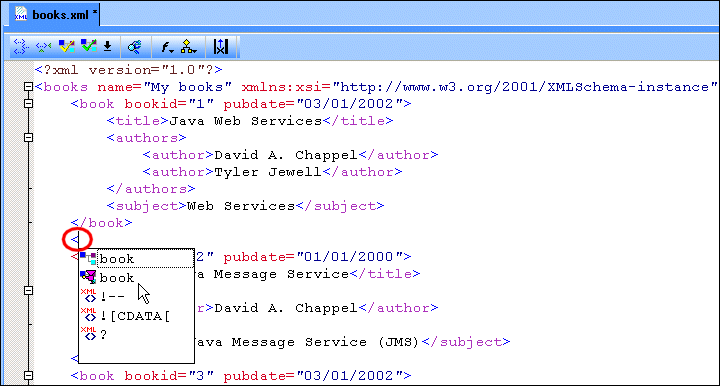 As you type, Sense:X prompts you with the possible tags that you can insert at a given location based on the XML Schema associated with the document you are editing. As soon as you type a tag's open bracket, Stylus Studio displays a scrollable list of the elements that are allowed at that location of the document. As shown in Figure 102, there are two entries for