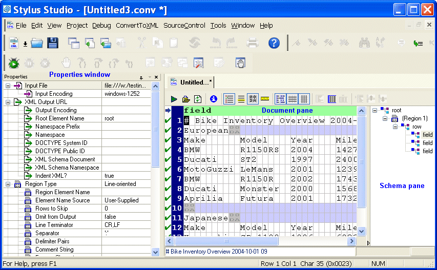 Home >Online Product Documentation >Table of Contents >Custom XML Converters Custom XML ConvertersIn Stylus Studio, you create a custom XML Converters by creating a custom XML conversion definition that allows the DataDirect XML Converters engine to convert proprietary files and extensions to standard formats. You create a custom XML conversion definition by selecting an input file and then using the Custom XML Conversion Definition Editor, shown in Figure 145, to specify the properties you want to use to convert that file (or others that share the same format). The Custom XML Conversion Definition Editor displays information read from the input file, as well a number of other properties you can specify (such as whether or not you want element names based on the file's first row, for example) that are used when the file is converted from one format to another. |