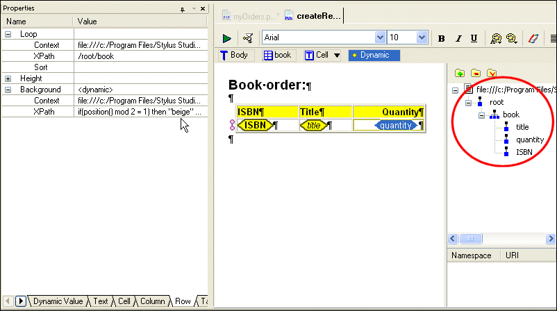 As shown in Figure 402, the XML Publisher The table, and the values in its columns, was created by simply dragging nodes from the source document tree and dropping them on the XML Publisher canvas. Additional formatting was specified using XPath expressions (to control row color and quantity color, for example). When the report design was complete, we used XML Publisher to generate XQuery and XSLT code using the Generate Transformation dialog box.