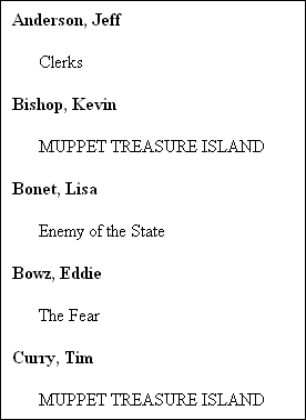 This example describes how to build a simple report in XML Publisher, shown here, that lists actors and the movies they have appeared in. The information for this report is based on the data in videos.xml, in the VideoCenter folder in the Stylus Studio examples project. Specifically, it matches the To create the example report: