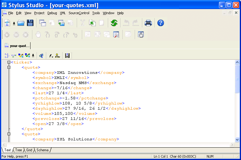 Stylus Studio displays the your-quotes.xml document in the XML editor. The initial view of the document is the Text view, as you can see by the tab at the bottom of the window.