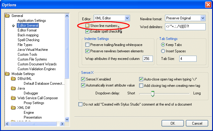 Home >Online Product Documentation >Table of Contents >Updating the Text of a Sample Document Updating the Text of a Sample DocumentWhen you update an XML document in the Text view of the XML editor, you can use the usual editing tools, as well as tools tailored for handling XML. Each of the following topics contains instructions for editing a sample XML document. You should perform the steps in each topic before you move on to the next topic. After the first topic, some steps depend on actions you performed in a previous topic. For more information on editing tools and features, see Using the Text Editor. This section provides instructions for Displaying Line NumbersStylus Studio lets you optionally display line numbers in most of its editors. Line numbers provide simple, unobtrusive points of reference that can make working large or complex documents easier. Line numbers are off by default; turn them on now. To display line numbers: