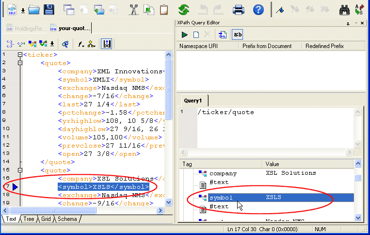 In the Text view, Stylus Studio uses its back-mapping feature to move the cursor to the source element for the symbol result element you clicked.