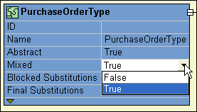 In-place editing allows you to change node names and properties directly in the diagram. For example, say you want to change the value of the Mixed property of the PurchaseOrderType complexType. Just double-click the property. Stylus Studio opens the property for editing, as shown in Figure 60.