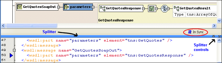 Home >Online Product Documentation >Table of Contents >Text Pane Text PaneThe text pane appears below the diagram pane. The two panes are separated by a horizontal splitter, as shown in Figure 374. If you want, you can display WSDL document text and the diagram at the same time, using the splitter to change the relative size of the text and diagram panes. You use the splitter controls to hide either the text pane or the diagram pane with single click. As you edit the document, using either the diagram or text area, Stylus Studio displays informational messages as changes are being made and when the two views are synchronized. Text and diagram views are synchronized automatically.