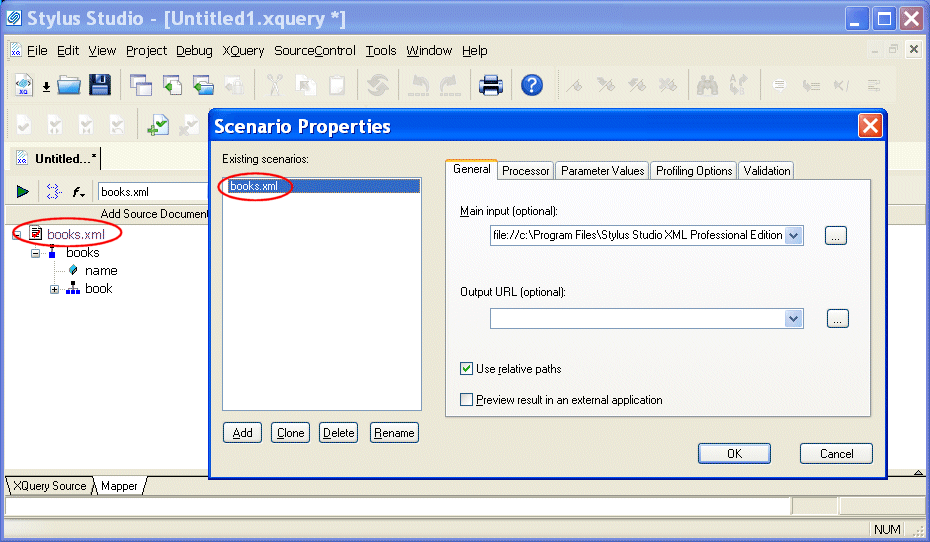 See Source Documents and XML Instances to learn more about how Stylus Studio treats source documents. See Creating an XQuery Scenario to learn more about XQuery scenarios.