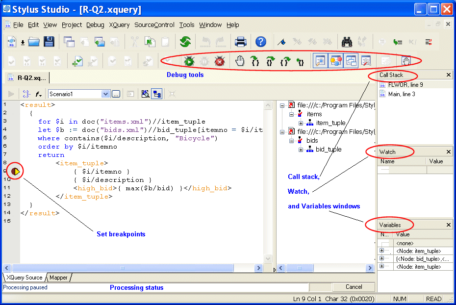 Home >Online Product Documentation >Table of Contents >Debugging XQuery Debugging XQueryComplex XQuery requires robust debugging tools. With Stylus Studio, you can This section covers the following topics: |