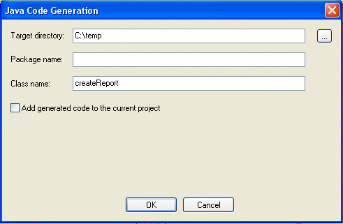 - Optionally, a package name. If you specify a package name, this name is used for a subfolder created in the target directory you specify. If you specify myPackage as the package name, for example, the generated code is written to