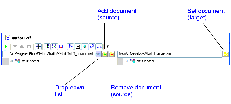- Drop-down list. You use the drop-down list to change the current document in the XML Diff Viewer. When you change the current doc in a multi-document diff, the target document display - specifically, the symbols and colors used to identify documents - typically changes, as well. See