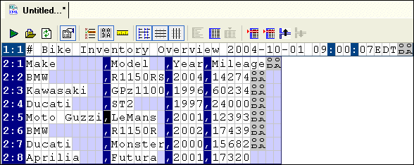 Home > Online Product Documentation > Table of Contents > Defining and Joining Regions Defining and Joining RegionsAn input file can contain any number of regions; fixed-width and line-oriented can exist in the same file. The Convert to XML Editor provides tools that allow you to define new regions and join existing ones. This section covers the following topics: Defining a RegionWhen you define a region in an input file, Stylus Studio splits the region at the current cursor location. The new region starts with the character on which the cursor resided when the region was defined, but it can be of either type - fixed-width or line-oriented - regardless of the type of the original region. Consider the following input file: