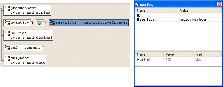 Home > Online Product Documentation > Table of Contents > Node Properties Node PropertiesThe Properties window is available when you are using the Diagram or Tree tab of the XML Schema Editor. To display the properties for a given node, just click the node. If you have selected a restricted node from a redefined XML Schema, Stylus Studio displays a separate section in the lower half of the Properties window for you to specify the facets, as shown in Figure 213.