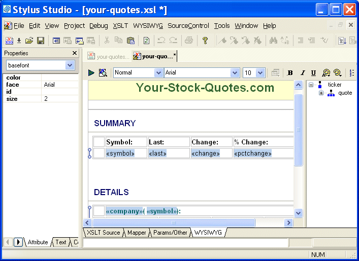 The WYSIWYG tab is a graphical XSLT editor that lets you compose XSLT by constructing the HTML document you want the XSLT to output. To work with the WYSIWYG tab: