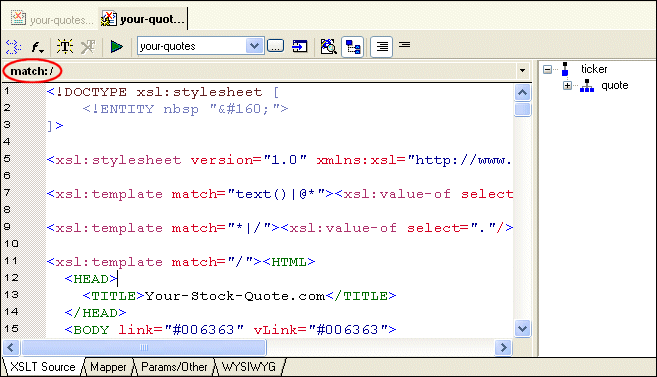 In the status bar just below the XSLT Editor tool bar, Stylus Studio displays match: /. This indicates that the location you clicked is inside a template that matches the root node.