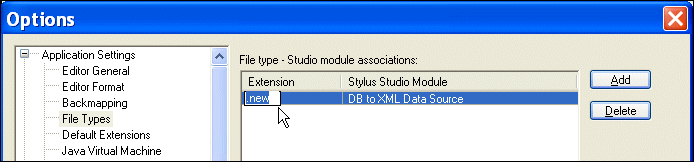 File type - Stylus Studio module associations. This dialog box allows you to indicate the module you want Stylus Studio to use when it opens a file with the extension you specify.