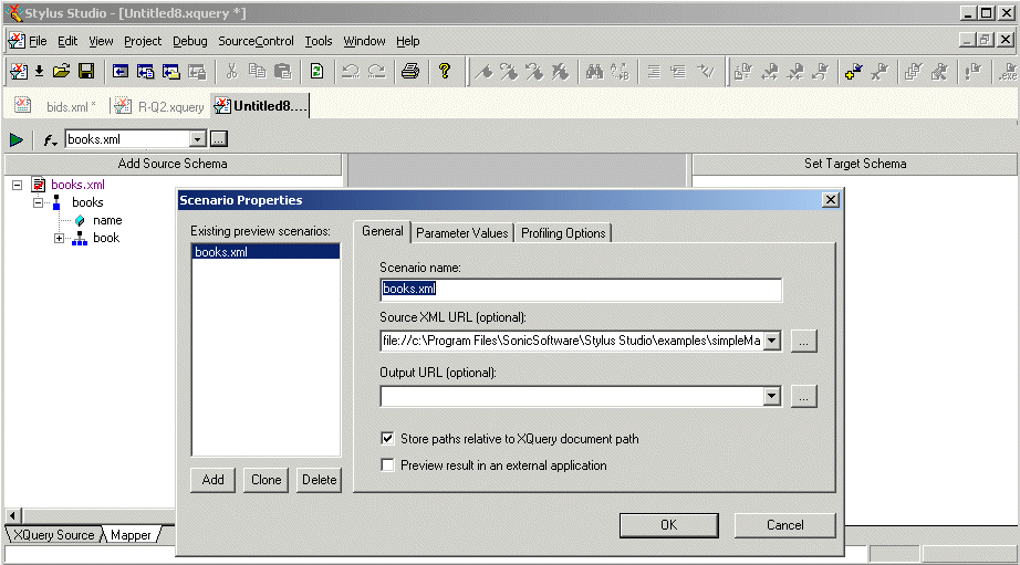 By default, Stylus Studio uses the first XML document you add to the XQuery mapper as the source XML for the XQuery scenario, as shown here: The document specified in the Source XML URL field on the Scenario Properties dialog box is the document used to preview XQuery results. You can select this association for another XML document if you choose, but only one source document may have this association.