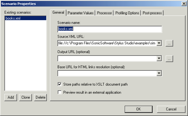 Home > Online Product Documentation > Table of Contents > Overview of Scenario Features Overview of Scenario FeaturesThis section describes the main features of XSLT scenarios. It covers the following topics: Specifying XML Source DocumentsThe main benefit of the XSLT scenario feature is that it lets you specify the XML document against which you want to run your XSLT. By default, Stylus Studio uses the first source document you add using the XSLT mapper as the XML source document for the scenario. You can specify the XML source document setting on the General tab of the Scenario Properties dialog box.
