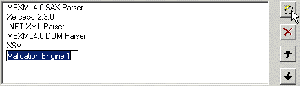 You should replace the default name ( Validation Engine 1, for example) with the name you want to associate with the custom validation engine. The name you enter is displayed in the drop-down in the XML Editor. Custom validation engines are displayed in the Validate Document drop-down list in the order in which they appear here. You can change the custom validation engine order by