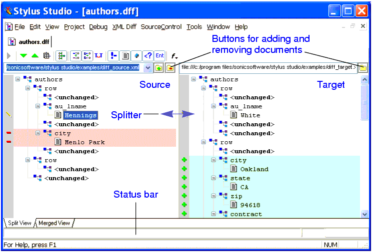 target. Stylus Studio considers the source document or folder to be the baseline, or current standard; the target document or folder is assumed to be some other version (it might be older or newer, for example) of the source. The Stylus Studio Diff tool illustrates how this other version, the target, differs from the source (or sources) you have selected.