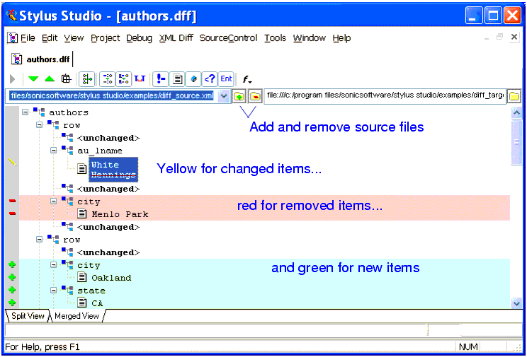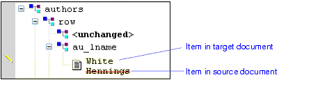 Customizable color-coding lets you quickly determine how one document differs from another - green, for example, identifies objects (such as elements and attributes) that are present in the target document, but which do not exist in the source document. When you hover the pointer over symbols displayed in the side bars of the source and target document windows, Stylus Studio displays a tool tip that indicates the specific nature of the change.