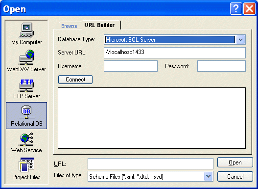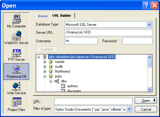 Home > Online Product Documentation > Table of Contents > Using the URL Builder Using the URL BuilderThe URL Builder utility lets you connect to a relational database server, select a table or view, and render that object as an XML document. You can use this feature, implemented on the URL Builder tab of the Open dialog box, to open a new XML document anywhere in Stylus Studio - in the XML Editor, the XQuery and XSLT Mappers, and so on.