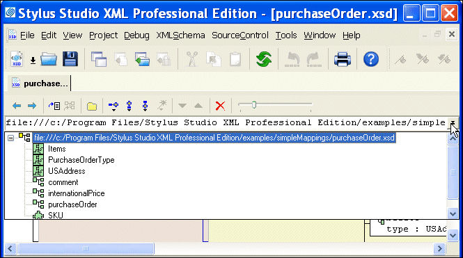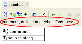 Stylus Studio supports backmapping between the text pane and the XML Schema diagram pane - if you click a node in the diagram, Stylus Studio scrolls the text pane to display the line of XML Schema that defines the node you clicked. A blue triangle is displayed to the left of the exact line of code. Definition Browser