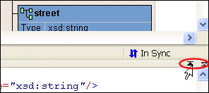 Stylus Studio synchronizes the diagram and text views of the XML Schema - any changes you make in the diagram are reflected in the text pane, and vice versa. Synchronization information is displayed in the bar that separates the diagram and text panes. Current status is displayed on the right. When the two views are synchronized, Stylus Studio displays this graphic: