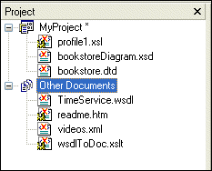 Other DocumentsStylus Studio displays documents that are not associated with a project in the Other Documents folder, which appears after the last folder or document in the currently displayed project. In addition, when you remove a file from a project, it is placed in the Other Documents folder.