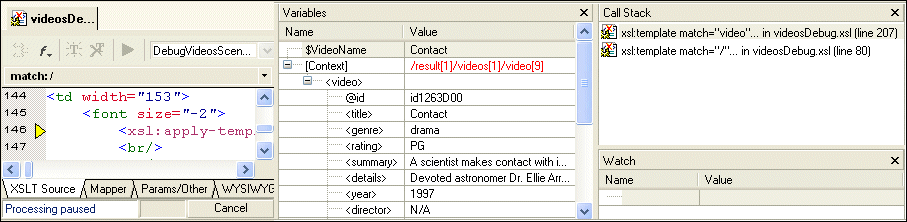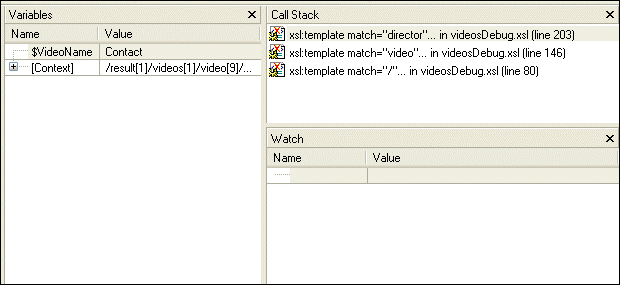 Gathering Debug Information About the Sample FilesThis topic is part of a sequence that starts with Setting Up Stylus Studio to Debug Sample Files. When XSLT processing is suspended at a breakpoint, Stylus Studio displays the Variables, Call Stack, and Watch windows.