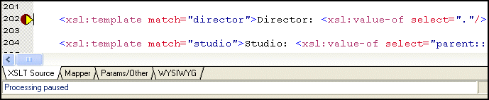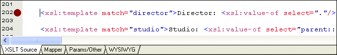 1. In the XSLT Editor, click in line 202. Line numbers appear in the lower right corner of the XSLT Editor window. Line 202 starts with