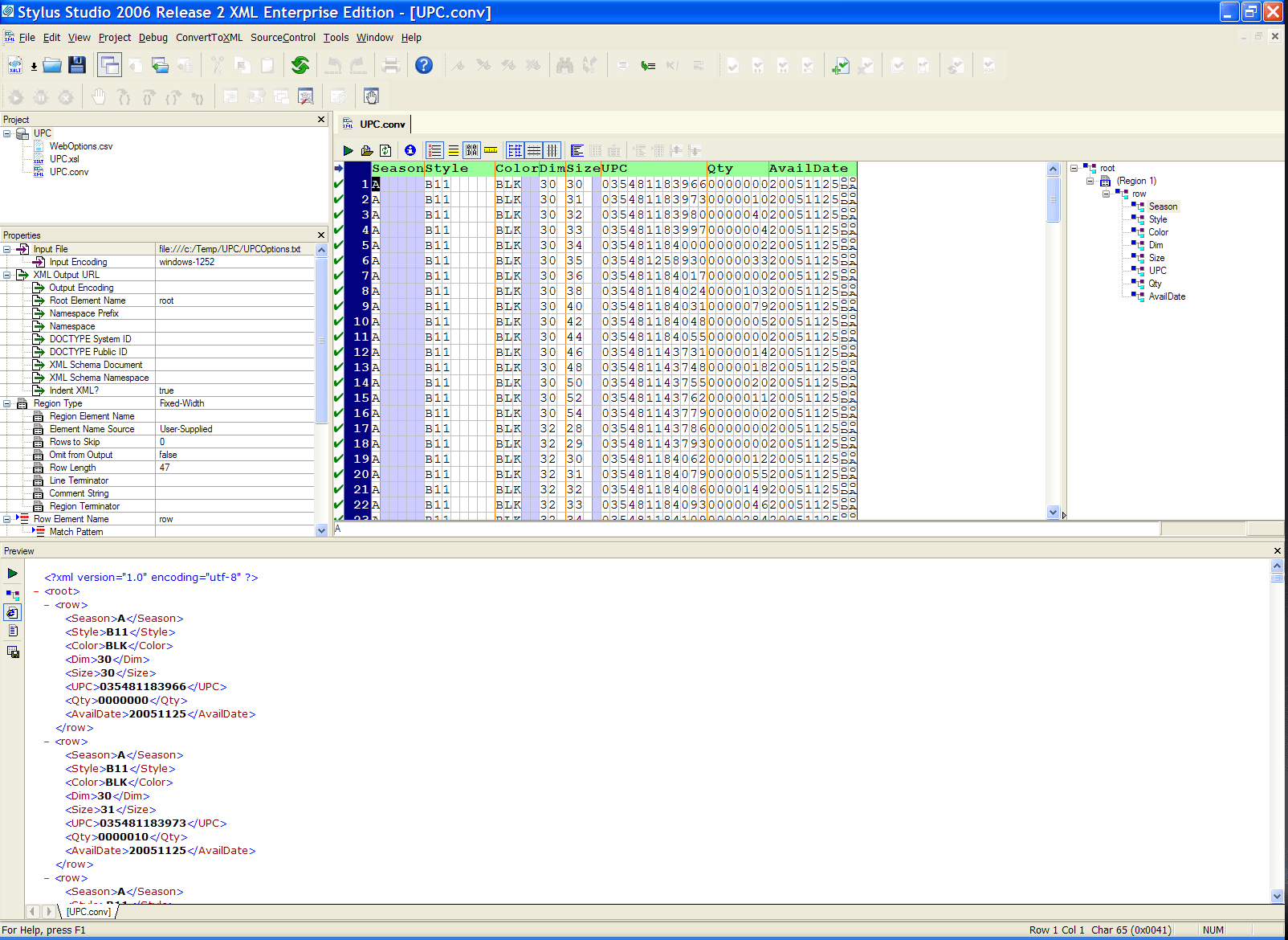 So for each style (loop), for each color (loop) and write to new file with added text elements. The transformation path would be something like UPCOptions.txt -->UPCOptions.xml --> WebOptions.xls