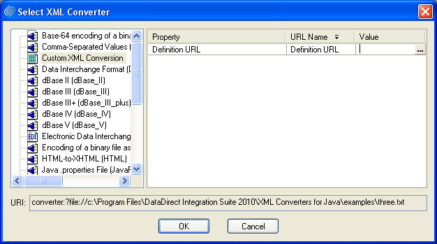 There is no + symbol next to the Custom XML Conversion choice indicating that there are no customizations available even though I have created one. Clicking on the Custom XML Conversion choice reveals no converters and there is no option for browsing to the cnverter location.