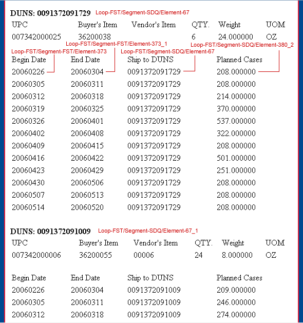 For each DUNS i want to list all the Element-373(_1), 380_2, 234(_1), 356, 357, 355_1 information that is available in any Loop-LIN occurence where the same DUNS is listed in the same Element67* element...